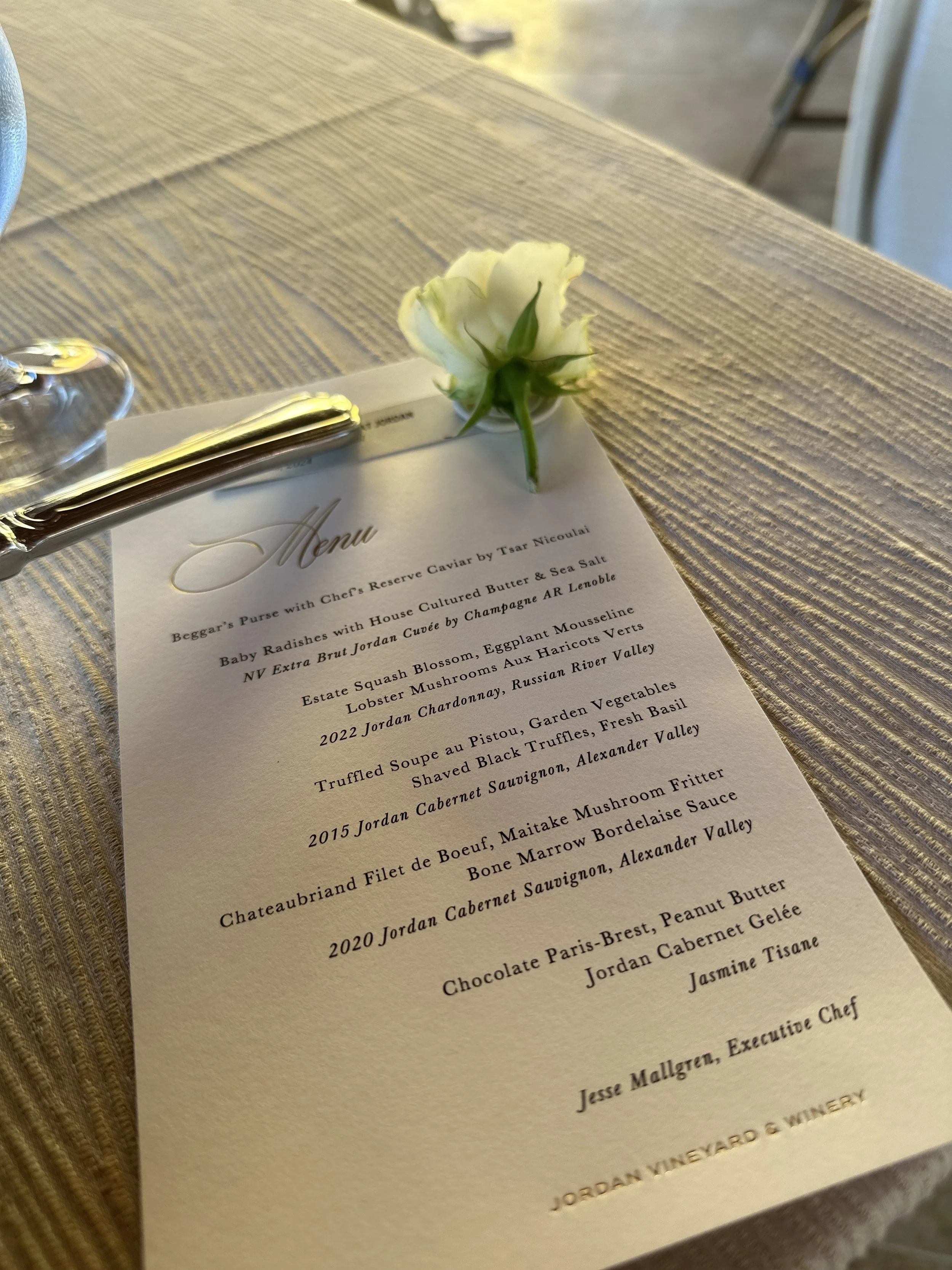 We also experienced a truly delicious dinner that included an exceptional fine wine and food pairing at the renowned Jordan Vineyard and Winery. The food was not only exquisite but meticulously prepared, featuring local ingredients that beautifully complemented their most delicious wines. Both the carefully chosen wine pairings and the entree decisions were perfectly meshed together, creating a harmonious experience for a memorable and perfect evening!